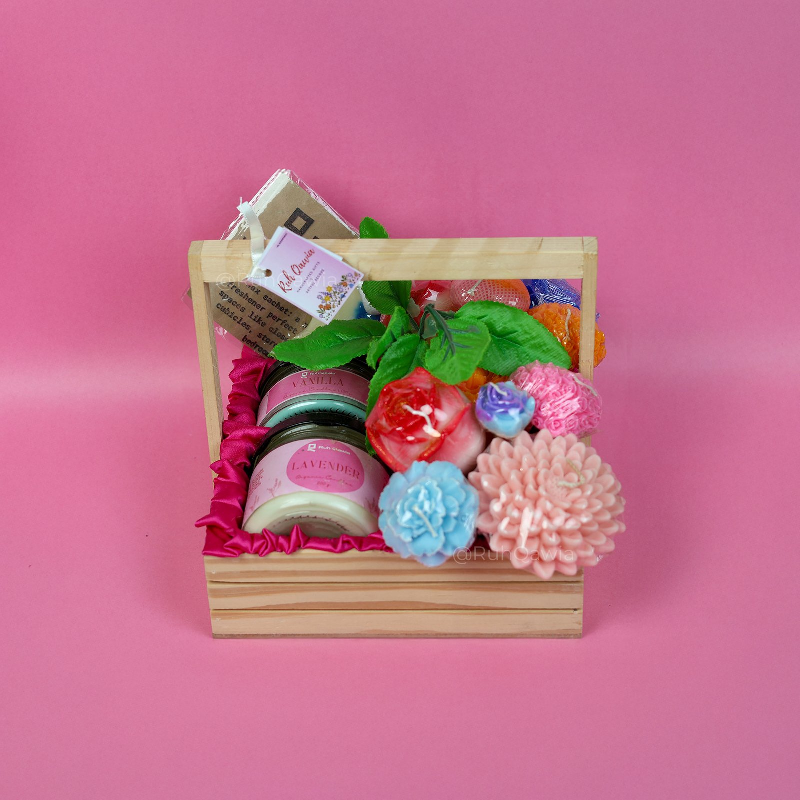 A handcrafted Candle Bouquet Set in a pinewood basket (10×10), featuring 120g and 200g candles, an organic wardrobe freshener, and a stunning bouquet of flower candles. Customize each element with your choice of fragrance. Made with 100% organic soy wax.