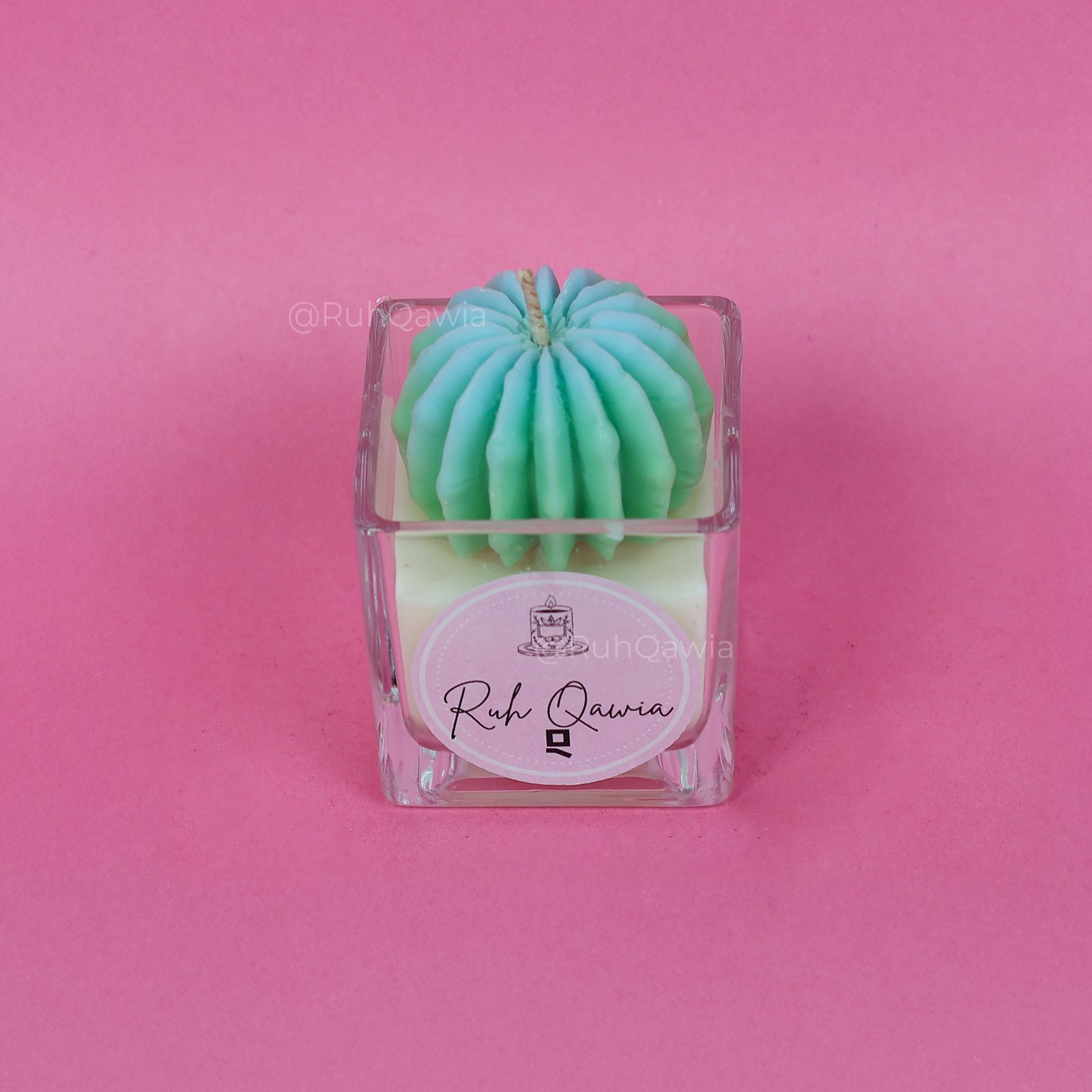 - Design: Glass jar with a wax cactus in light blue-green hues.