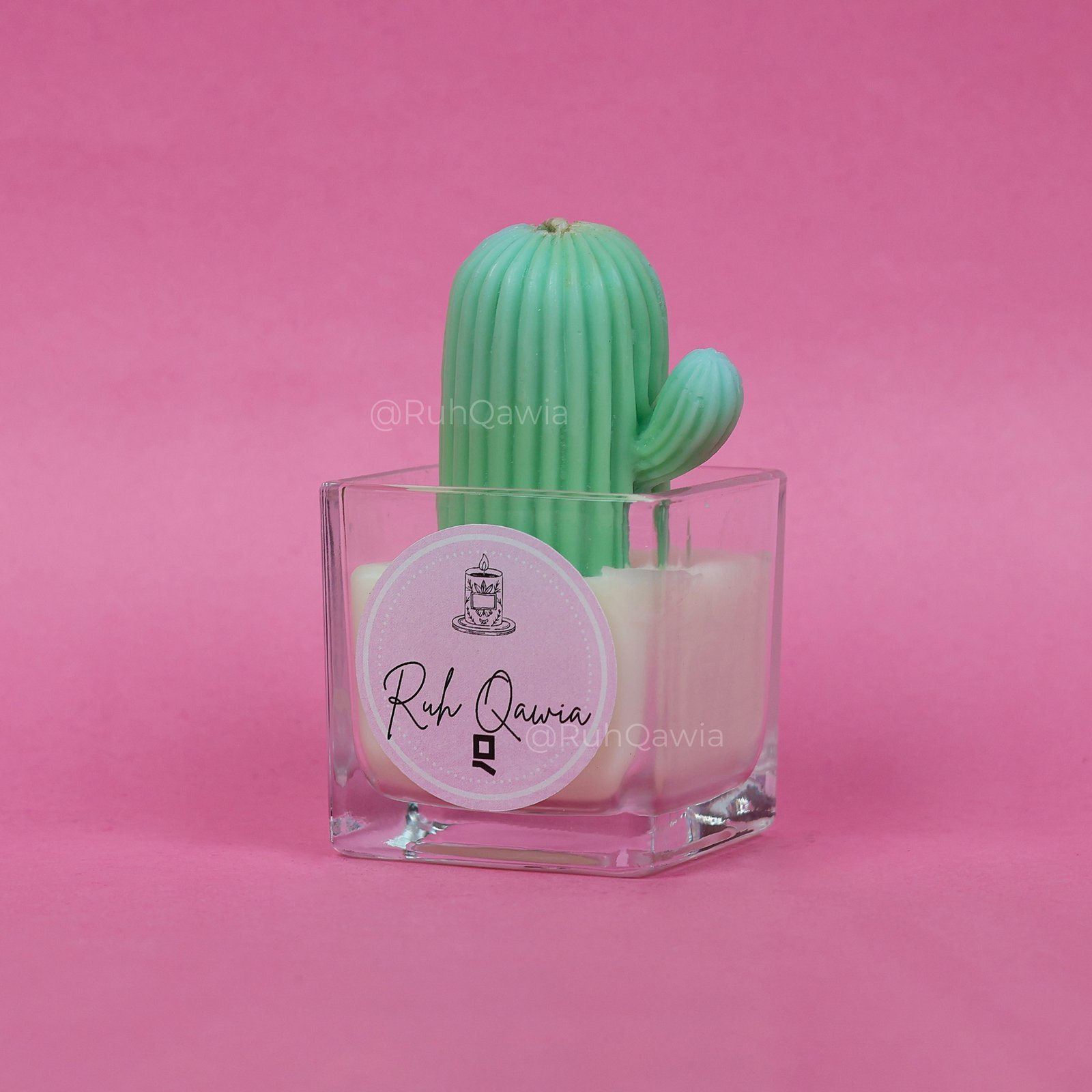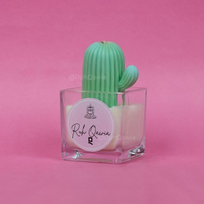 - Design: Glass jar with a long cactus-shaped wax design in green.